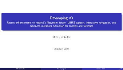 Join us for a fast-paced overview of the recent enhancements to radare2’s filesystem library. We’ll explore the addition of UBIFS support, the introduction of a visual, interactive interface for filesystem navigation, and new capabilities for extracting metadata and recovering on-disk file locations. Learn how these improvements fill in the missing bits and open up new possibilities for filesystem analysis, debugging, and forensics in radare2.